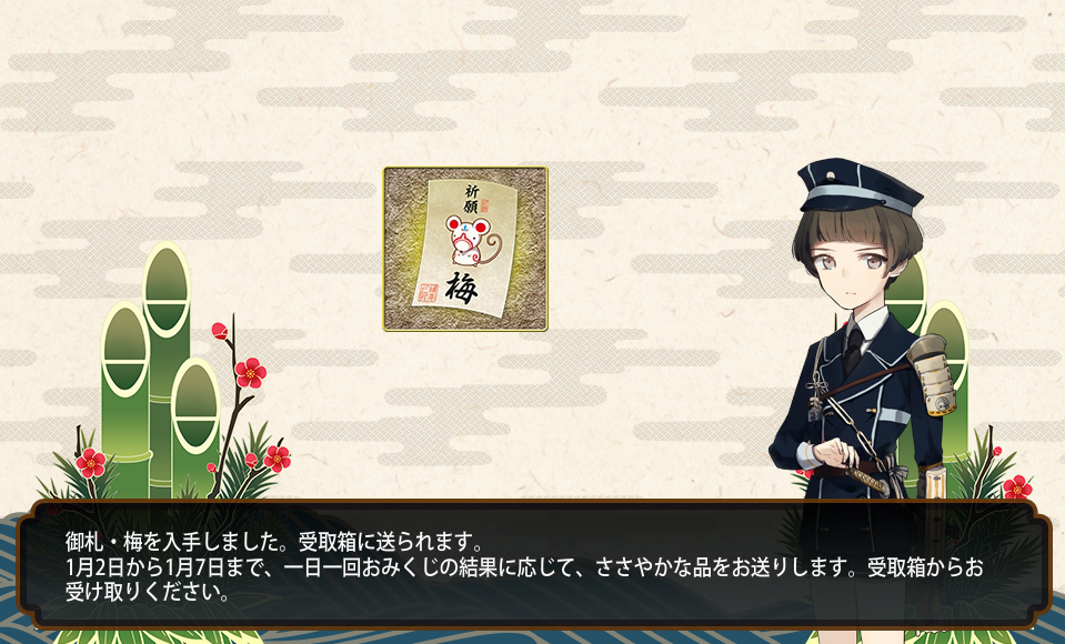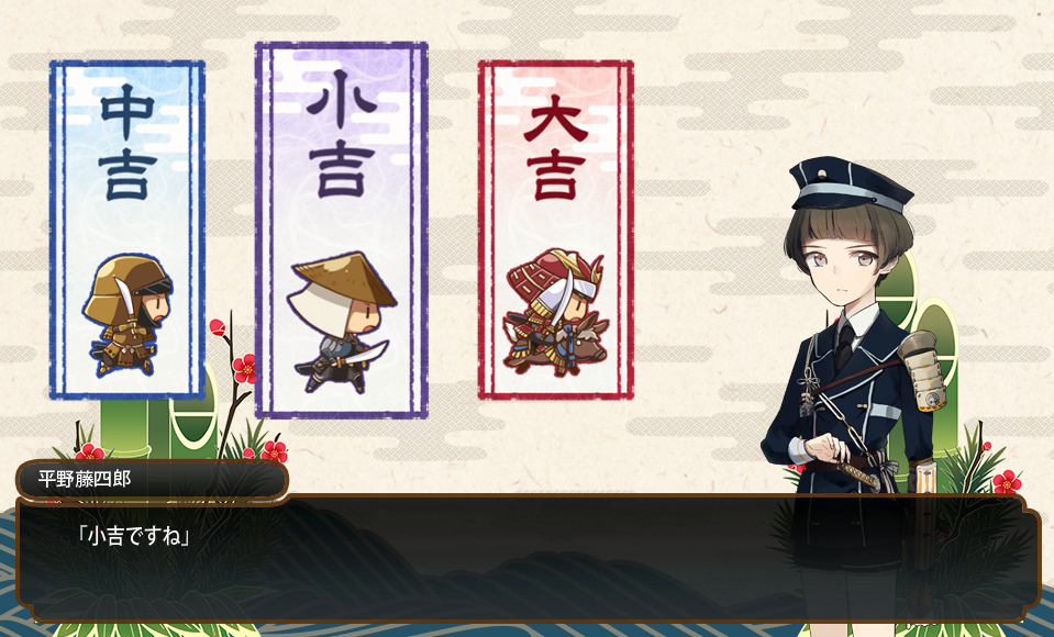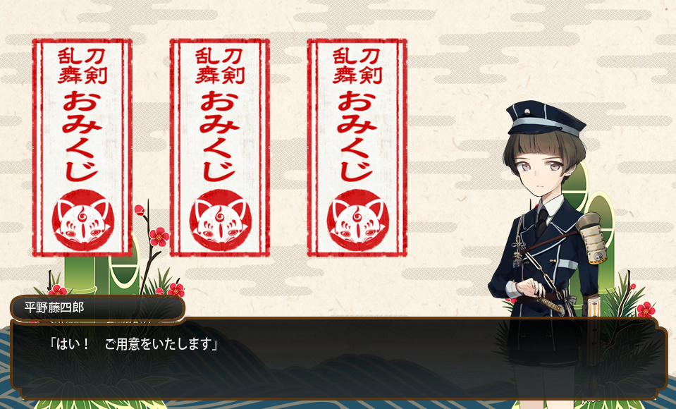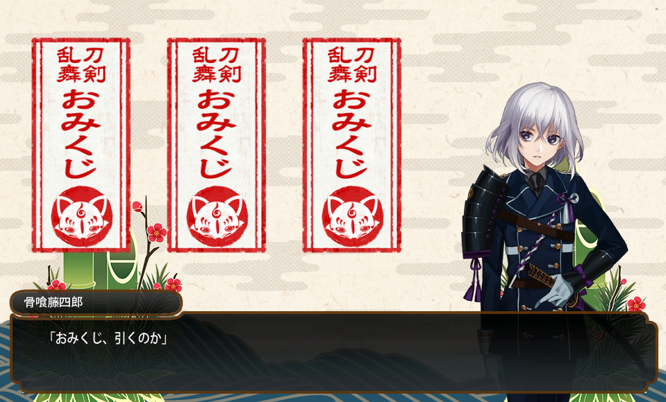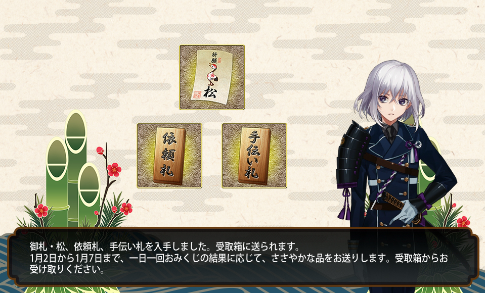 2016/01/05 Category : ゲーム 刀剣乱舞 四日五日で鍛刀大捕物 昨日から期間限定鍛刀キャンペーンはじまりましたね!(1月4日~1月13日)刀本丸では明石と日本号がいまだ未実装なんで早速鍛刀してみました。近侍/(桜有)山姥切国広 Lv.95配分/910/890/910/910鍛刀2回目(松札)にて鶴丸!!明石かな???ってワクワクしたのに鶴!!!いや…いいんだけどさ!!!って思ってたら3回目(こっちは札無)も鶴!!!!もぅ物欲センサーってすごいですね!!!!ちなみに阿津賀志山でもドロップしました!!!鶴!!!あと松札で鶯丸と三日月さん、梅札で陸奥守、富士札で鳴狐本日、松札が有効だと思いました。あとTwitterのフォロワーさんとこでも尽く鶴丸降臨だったのでサプライズデーだったのかな…と。14回担当した結果のレア4・5なかなかの大物捕縛でした。欲しいのは掠りもしなかったんですが。 4日のおみくじ。/大吉5日のおみくじ/小吉これで大吉/中吉/小吉と揃ったようです。おみくじで入手できるアイテム 大吉/松札・依頼札・手伝い札 中吉/竹札・依頼札 小吉/梅札 PR Comment0 Comment Comment Form お名前name タイトルtitle メールアドレスmail address URLurl コメントcomment パスワードpassword