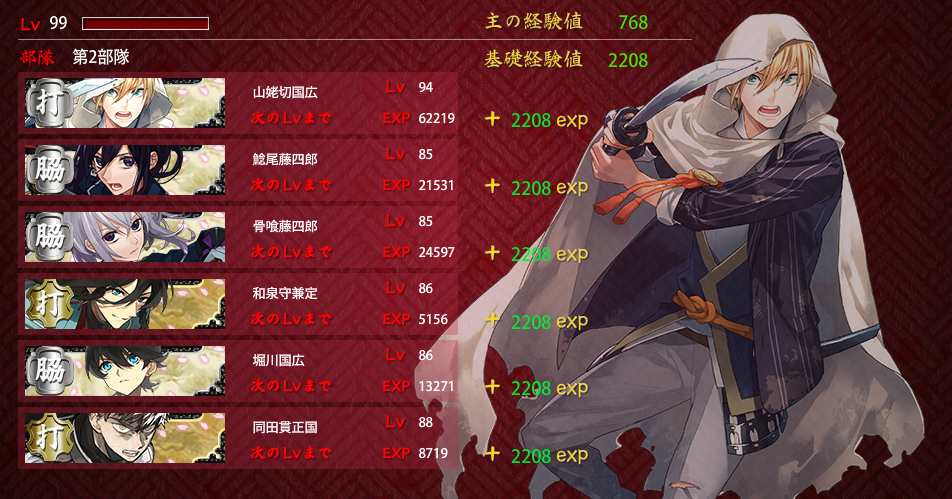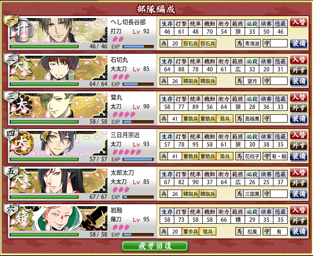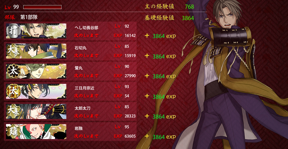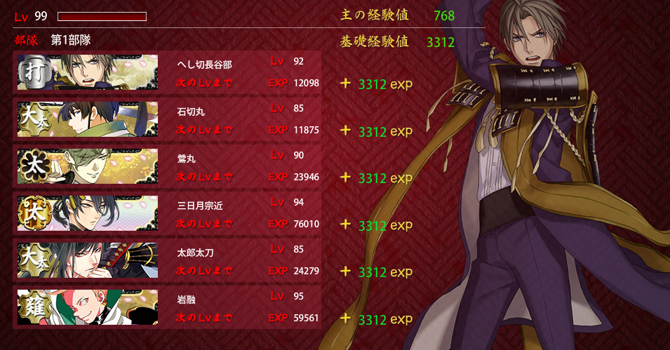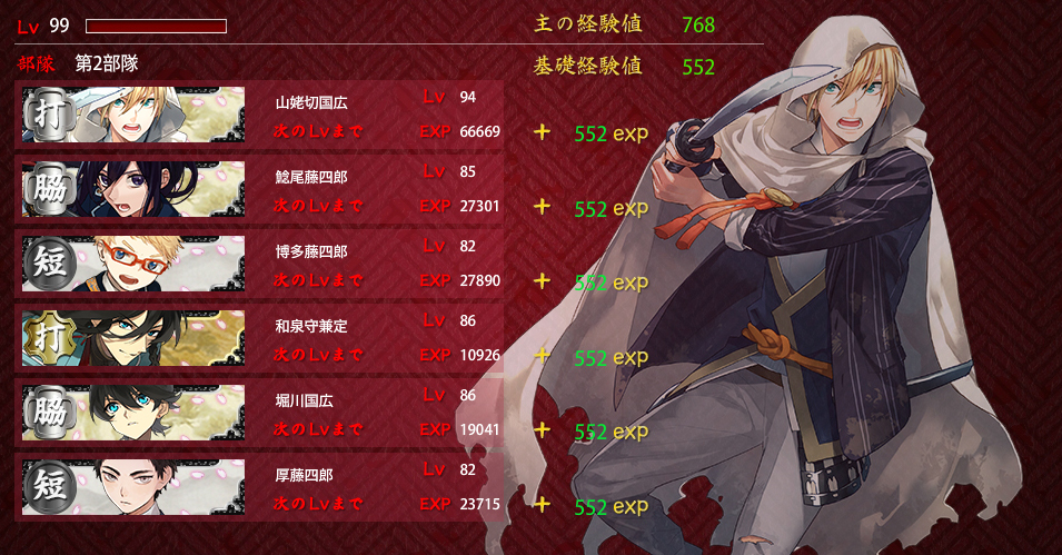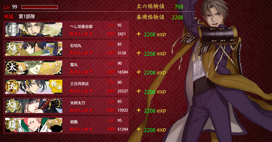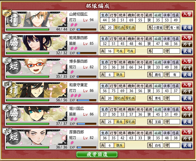 2016/01/04 Category : ゲーム 連隊戦/難ステージ 連隊戦難ステージ昼/昼/夜/夜/昼/昼/夜/屋内計8戦チャレンジメンバーはこちらで。部隊一は物吉くんと一期さんが入れ替わってますが引き続きの絶賛育成中メンバー。部隊二はカンスト組除いて個人的ベストメンバー。部隊一のメンバー除いてですが。ウチの初期刀国広(機動重視)・能力値高い三日月さんのLv.90↑コンビ打撃重視打刀の兼さん、二刀開眼・必殺狙いで討取り上手な堀川くん広範囲で大太刀の太郎さんと、高ダメージ用に槍の御手杵昼昼夜夜昼/勝利C⇒交代後藤3戦目で刀装(金投石)破壊/4戦目で一撃中傷/5戦目で重傷昼夜屋内/勝利Bこの時のドロップ/同田貫正国計5戦勝利評価/AAAACLv.40台の短刀では刀装1個しか持てないのもあって昼戦が厳しいところ。Lv.40台脇差はギリギリラインかなぁ…。 計3戦勝利評価/AAB太刀・大太刀・槍は夜は何とかでも屋内夜戦は全くもってアウトでした…。被ダメージは問題なかったんだけど攻撃力に欠けて、敵が残ってしまった。1戦15個×8戦×1.8=216個勝利評価は無関係 色々再編成して試してみました。まず、ポイント配分から。A勝利×8戦主の経験値/768基礎経験値/4416隊員/4416A勝利×7戦基礎経験値/3864隊員/3864A勝利×6戦基礎経験値/3312隊員/3312A勝利×5戦基礎経験値/2760隊員/2760A勝利×4戦基礎経験値/2208隊員/2208部隊一の三日月さん(Lv.80)はうっかり刀装無しで突っ込んだ結果です。刀装無しでも4戦ぐらいなら何とかなるっぽいです…。A勝利×3戦基礎経験値/1656隊員/1656A勝利×2戦基礎経験値/1104隊員/1104A勝利×1戦基礎経験値/552隊員/552A勝利1戦につき基礎経験値・隊員ポイント=552B勝利1戦につき基礎経験値・隊員ポイント=460C勝利1戦につき基礎経験値・隊員ポイント=460B・Cともポイント一緒なの?BとC勘違いしたかな??ってなったけど…多分合ってると思います…。昼夜同様、屋内戦も同じポイント数です。今回の部隊編成単体戦/8戦オールA勝利だった編成元太刀メンバー含めての打刀・脇差昼/夜/屋内すべて戦うならベターな編成かなぁ…自分としては。金投石・脇差は防御力上げに金盾兵も装備。念のため、偵察値上げに部隊長に青海波、打撃力上げたいので兼さんに青毛装備。打撃+5ってどれぐらい有効か分かってないですが。2部隊編成/各4戦オールA勝利部隊一/昼・夜偵察値・起動要員/長谷部を部隊長あとは物理極振りで偵察値上げに長谷部に青海波、打撃・機動+で石切さんに望月あとは機動+で装備部隊二/昼・夜・屋内屋内戦重視で編成Lv.80あるから短刀入れたけどレベル足りなかったら昼戦考慮して打刀・脇差編成にすると思う。刀装は遠戦重視で。白刃戦までに出来るだけ敵の戦力削る方向で。同じく偵察値上げに国広に小雲雀装備考えてるようでやんわりだしほどんどがレベルでクリアしてる気がしますがこうかなぁ…?と刀種の特性で編成組むの楽しいです。うっかり途中で中断⇒再ログインした時の。この時、再開できる仕様で本当に良かった…と心底思いました。 PR Comment0 Comment Comment Form お名前name タイトルtitle メールアドレスmail address URLurl コメントcomment パスワードpassword